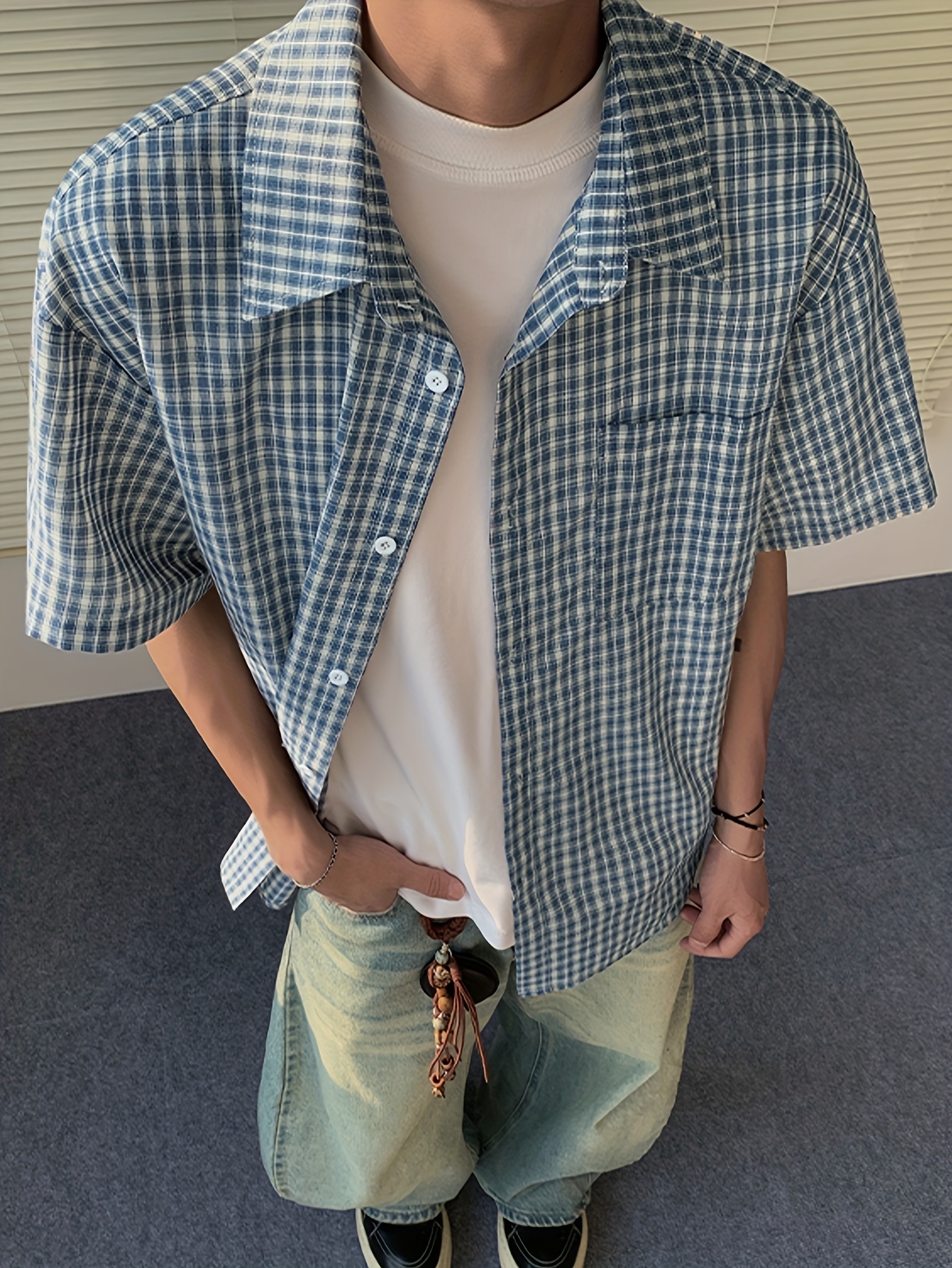 Men's Casual Plaid Short Sleeve Shirt - Loose Fit Summer Shirt with Classic Collar,